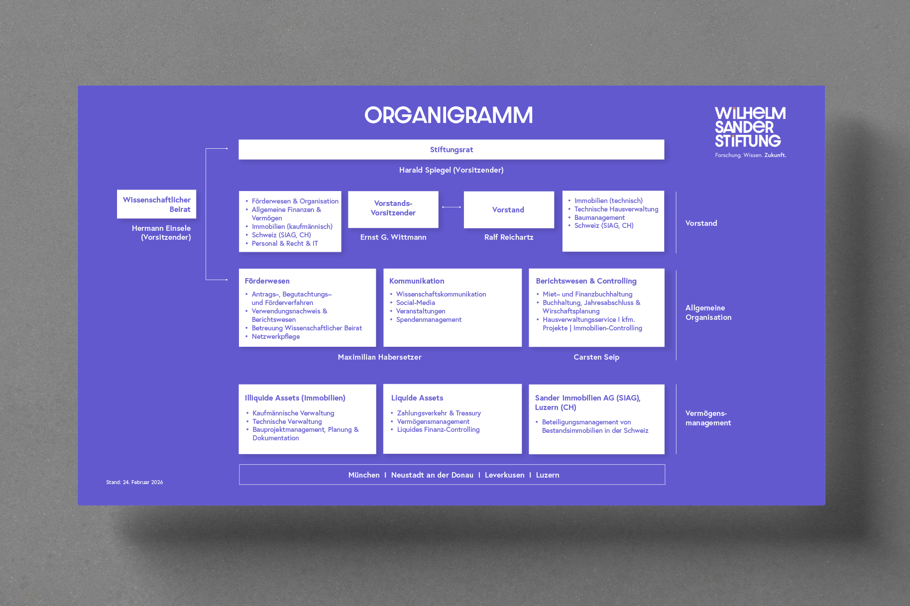 Die Wilhelm Sander-Stiftung wird von drei Gremien getragen: Der Stiftungsrat überwacht als oberstes Organ die Stiftung, der Vorstand führt die laufenden Geschäfte und der Wissenschaftliche Beirat berät mit fachlicher Unabhängigkeit in der Mittelverwendung. Gemeinsam gewährleisten sie eine verantwortungsvolle, transparente und förderorientierte Stiftungsarbeit im Dienst der medizinischen Forschung.